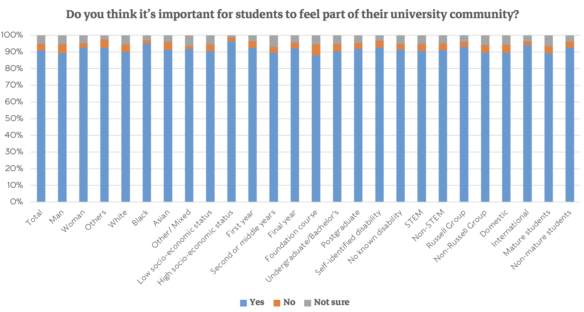 In the polling accompanying the report (carried out by our friends at Group GTI/Cibyl), there’s a remarkable consistency in the extent to which students think it’s important for students to feel part of their university community: