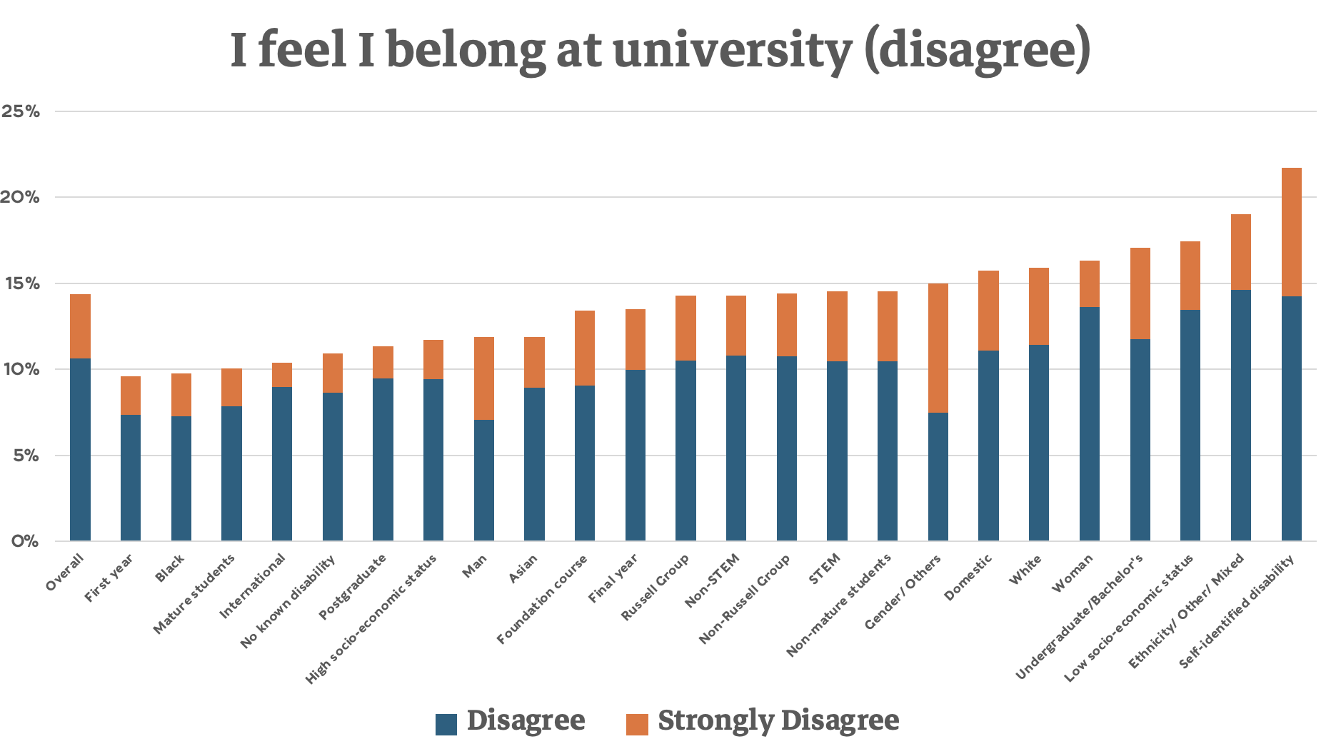 Disabled students are just as likely to agree that feeling part of the community is important – but much less likely to feel they belong, more likely to be lonely, less likely to be happy in higher education and and more likely to say that going to university has made their mental health worse.