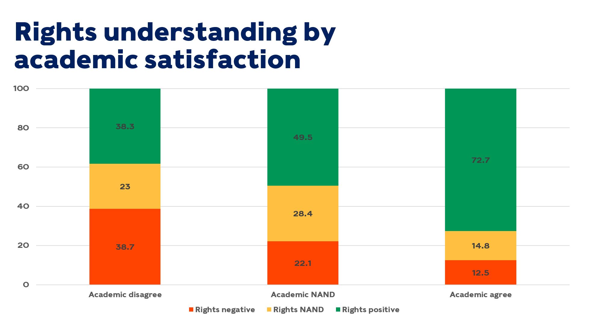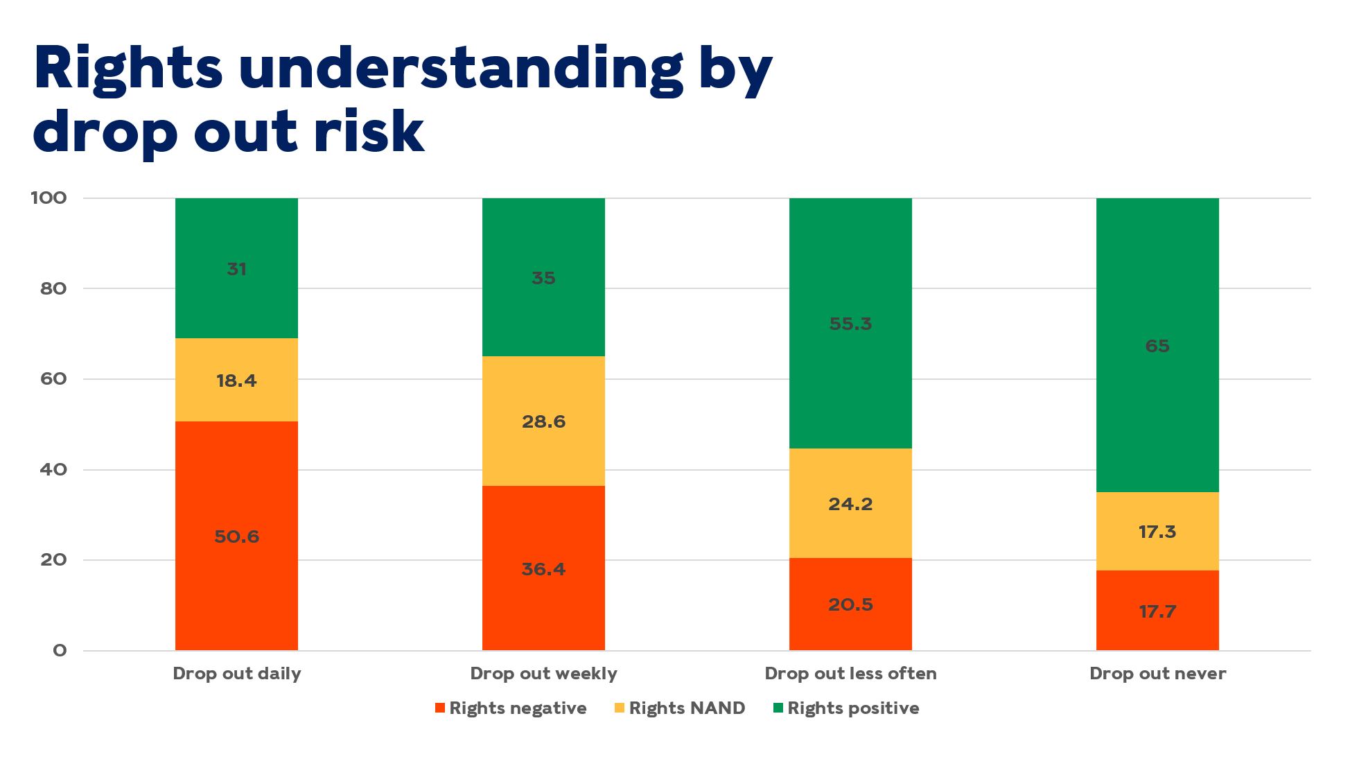 Concerningly, students “at risk” of dropping out (ie thinking about it on a daily or weekly basis) were more likely to say they were not clear about their rights and entitlements: