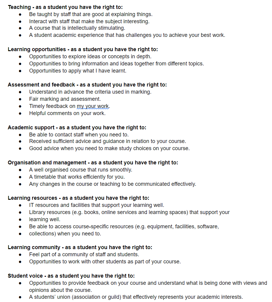 We could display it everywhere. We could ask courses/providers to explain to students “here’s how we do each of these”. It would mean students understood the grounds upon which they could base a complaint, not just the process. And it would mean that we maximise the chances of students being more assertive about their way in which their educational partnership should work early on.