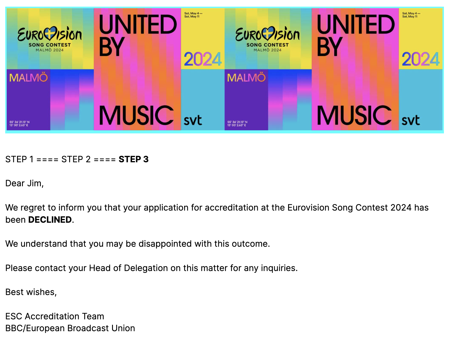 I know this is hard to believe, but the jumped up Eurocrats at the European Broadcasting Union (EBU) have somehow refused me media accreditation to cover the Eurovision Song Contest again.