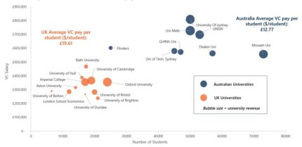 Further analysis between the UK and Australia paints an even more intriguing picture of executive salaries. Figure 3 analyses the ratio between the size of the student body verse the vice chancellor’s pay.