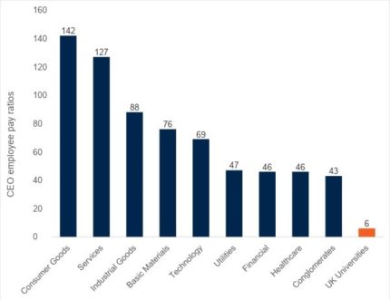 As Wonkhe has covered elsewhere, executive pay in UK higher education has been a point of tension for at least the past 25 years. In fact, this has been an issue across many sectors and it would appear for good reason. Figure 1 highlights the pay disparity between a CEO and the average staff member across a range of sectors.