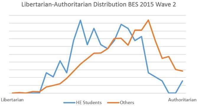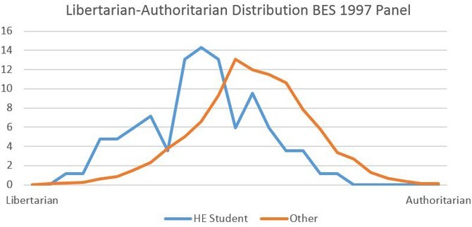 We can compare the average position of HE students to the general public on a liberal-authoritarian scale. A scale was created in the 1997 BES data, and when you separate HE students, you see a clear and significant difference between their position and that of the general public.