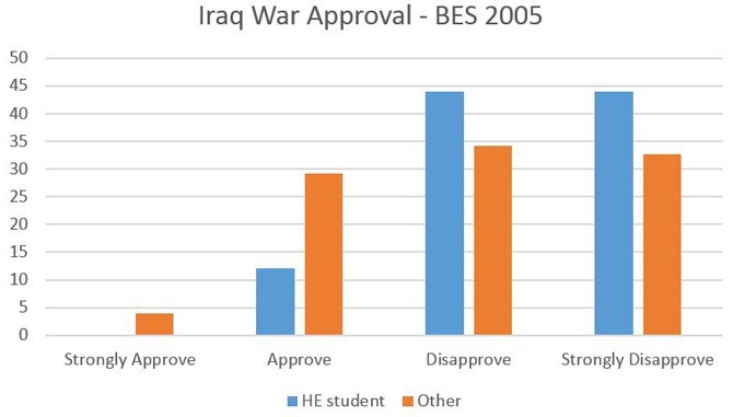 However, my point was to challenge, using BES 2005, the assumption that students were more approving of the Iraq War than non-students when they made their party choice at the election. I therefore used pre-election data to better capture the effect of the Iraq issue on the student vote, rather than assume that post-election opinion reflected opinion when deciding who to vote for. This methodological decision meant a smaller sample of students (N=66), and as with any small sample, some caution should be applied to the results. But I believe the clear difference in results of pre-election opinion on Iraq challenges the assumption that students were less disapproving of the Iraq War than non-students when they were deciding which way to vote in the 2005 general election.