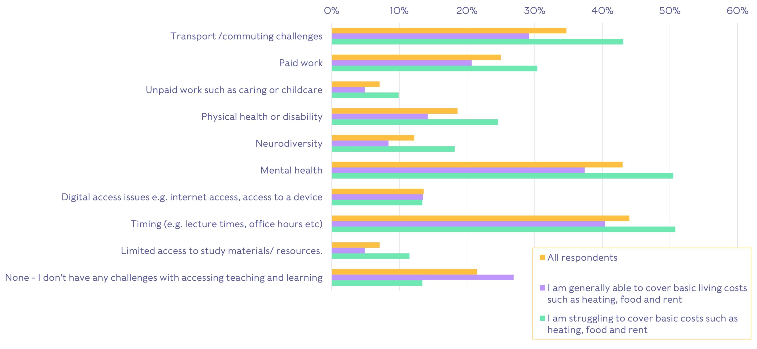When we asked students about the practical issues impacting on their access to learning (either face to face or online) we found that even among students who can meet basic living costs, there are issues, although not on the same scale as for those who are struggling.