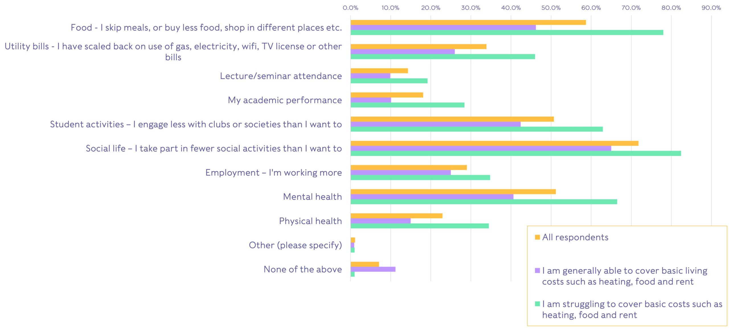In the graph above students who are struggling to cover costs are more likely to say that their attendance and their academic performance has been affected by cost of living challenges.