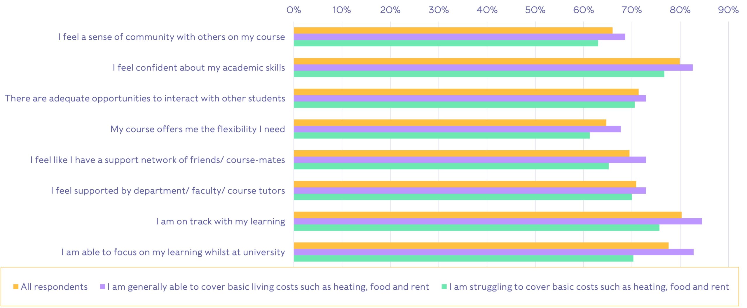 We asked a number of questions on a four point scale about students’ learning experience and sense of confidence, connection and support on their course. Students who are struggling to meet basic costs were somewhat less likely to agree in every case – though the largest differences relate to feeling on track and able to focus, and having a support network.