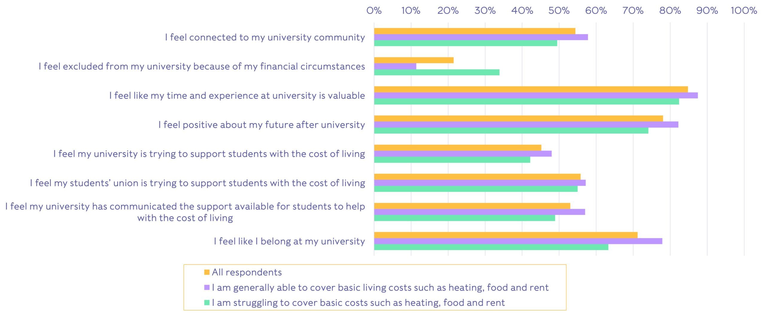Our questions on feelings about university focused on feelings of connection or exclusion, feeling supported with cost of living, and feeling positive about the value of time at university. Across all the questions we found differences between students who could meet basic living costs and those who said they were struggling to meet basic living costs.
