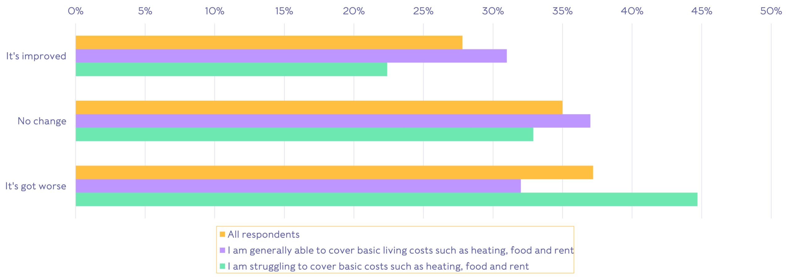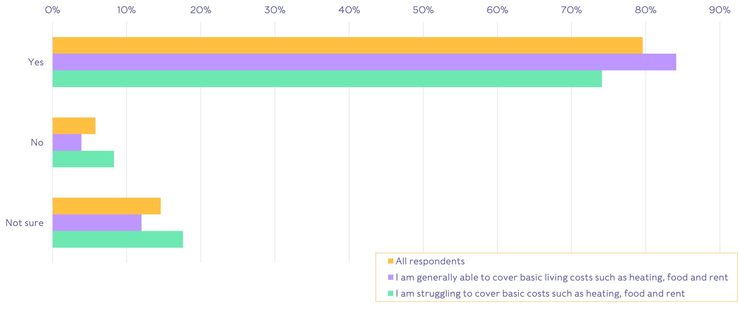 We asked respondents about their current financial situation based on their ability to cover what we described as “basic living costs, such as heating, food, and rent.” 6 out of 10 (60.5 per cent) said that they were generally able to cover basic living costs, and around third (35.4 per cent) said they were struggling to cover basic living costs. These two groups formed our comparator groups throughout the survey analysis.
