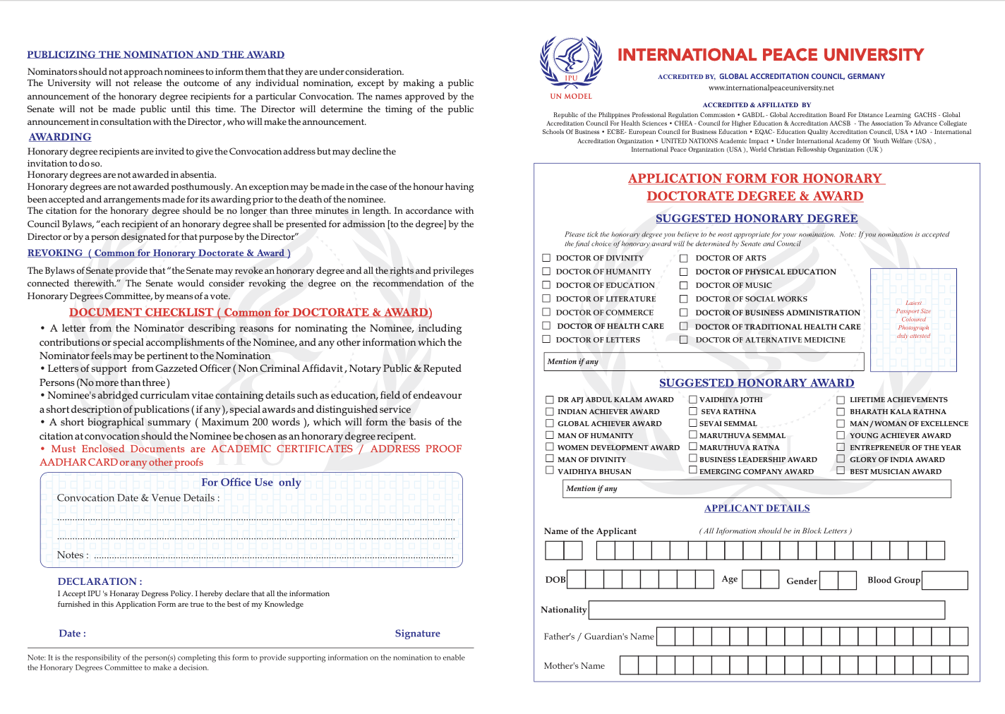 Also competing in the honorary degree space with IGPU is the very similarly named Global Human Peace University – the whole operation appears to be rather similar with again honorary degrees seemingly the primary award. Then there is the International Peace University which also provides a handy application form too: