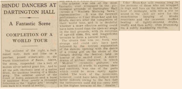 But before then, Leonard had accepted a job as secretary to Nobel-prize-winning polymath, poet and painter Rabindranath Tagore. This took him to India, where he supported Tagore’s work on rural reconstruction. This influenced him and Dorothy to attempt something similar in the UK, and in 1925 they purchased Dartington Hall. This became a home for all sorts of experimental work – on agriculture and rural economics and society, and also arts and creativity. About 1500 people worked on the estate; it gave concerts (the BBC broadcast the English Singers Quartet on 24 November 1934, and on Saturday 1 December 1934 a concert by Claud Biggs on the piano, accompanying contralto Astra Desmond); and the Western Morning News and Daily Gazette was entranced, on 28 May 1934, with Uday Shan Kar’s Hindu dancing.