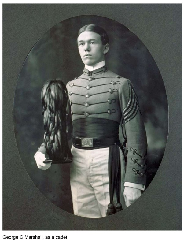 In 1947 General George C Marshall (pictured, when he himself was a student at the Virginia equivalent of Colonel Oates’ miliary academy), then Secretary of State, received an honorary degree. He used his speech to announce the Marshall Plan, via which the US supported the rebuilding of post-war Europe. To be fair this knocks most graduation speeches I have heard into a cocked hat.