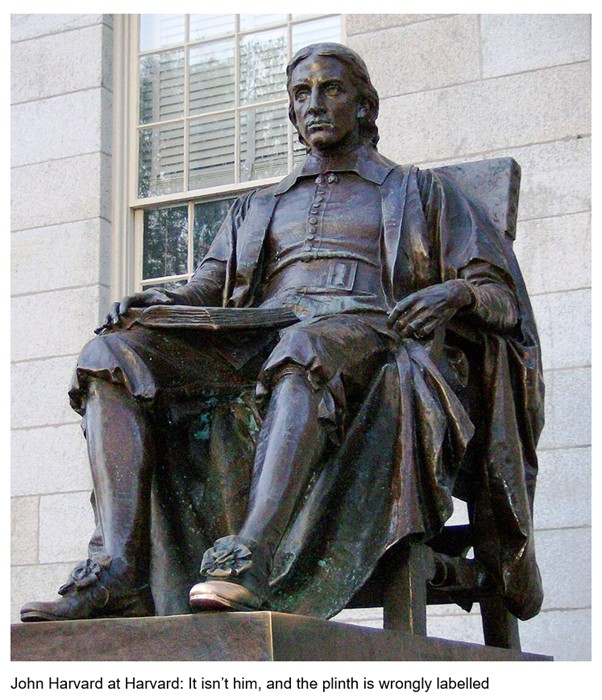 Here’s two fun facts: the statue of Harvard at Harvard says on its plinth that he was the founder. Not true. Also, it isn’t an image of Harvard, but of an 1884 student who was descended from an early president of the university.