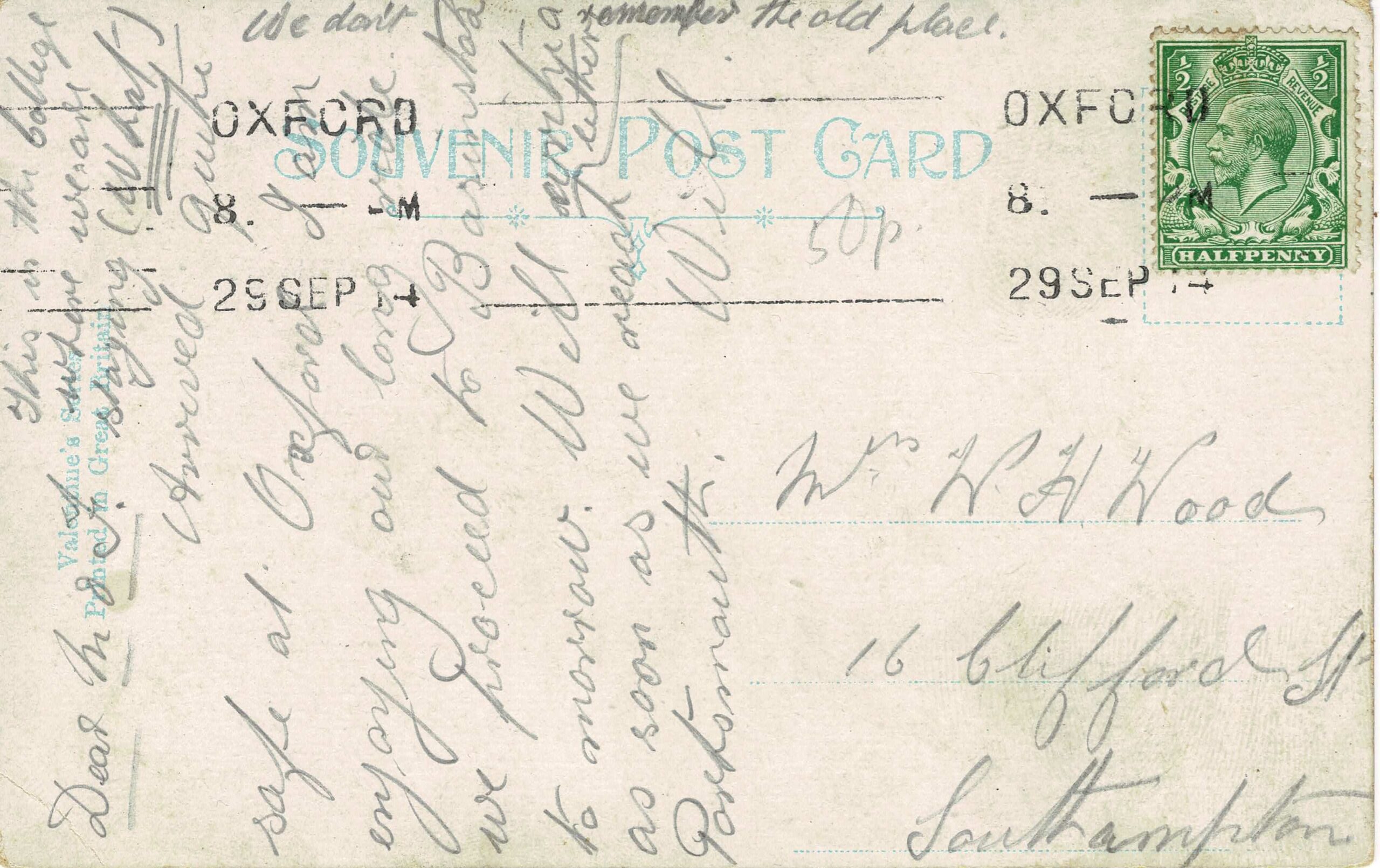 I am tempted to think that the card was sent as Will Wood stayed overnight as part of a military detachment on their way to Portsmouth for the continent, but I haven’t got anything other than the date of the card and one reading of its content to back that up. “C” Company of the No. 4 Officer Cadet Battalion was hosted at Keble College during the First World War, but the college’s archives hold no records of this before 1916. So I suspect speculation is all we have here.