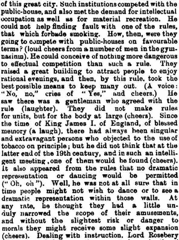The Borough story goes like this. In 1890, anticipating success, buildings were purchased: these had previously been the base of the British and Foreign School Society; the South London Polytechnic Institutes (Borough Road Site) Act 1890 authorised the purchase. In 1891 sufficient funds had been raised to proceed with the overall scheme, and an act of Parliament passed to create a legal basis for the new institutions. And in 1892 Lord Rosebery opened the polytechnic. His speech was notable for suggesting that by forbidding smoking in the new polytechnic, they would be unable to compete favourably with public houses. And that the structures against dancing and dramatic performances similarly might be too severe.
