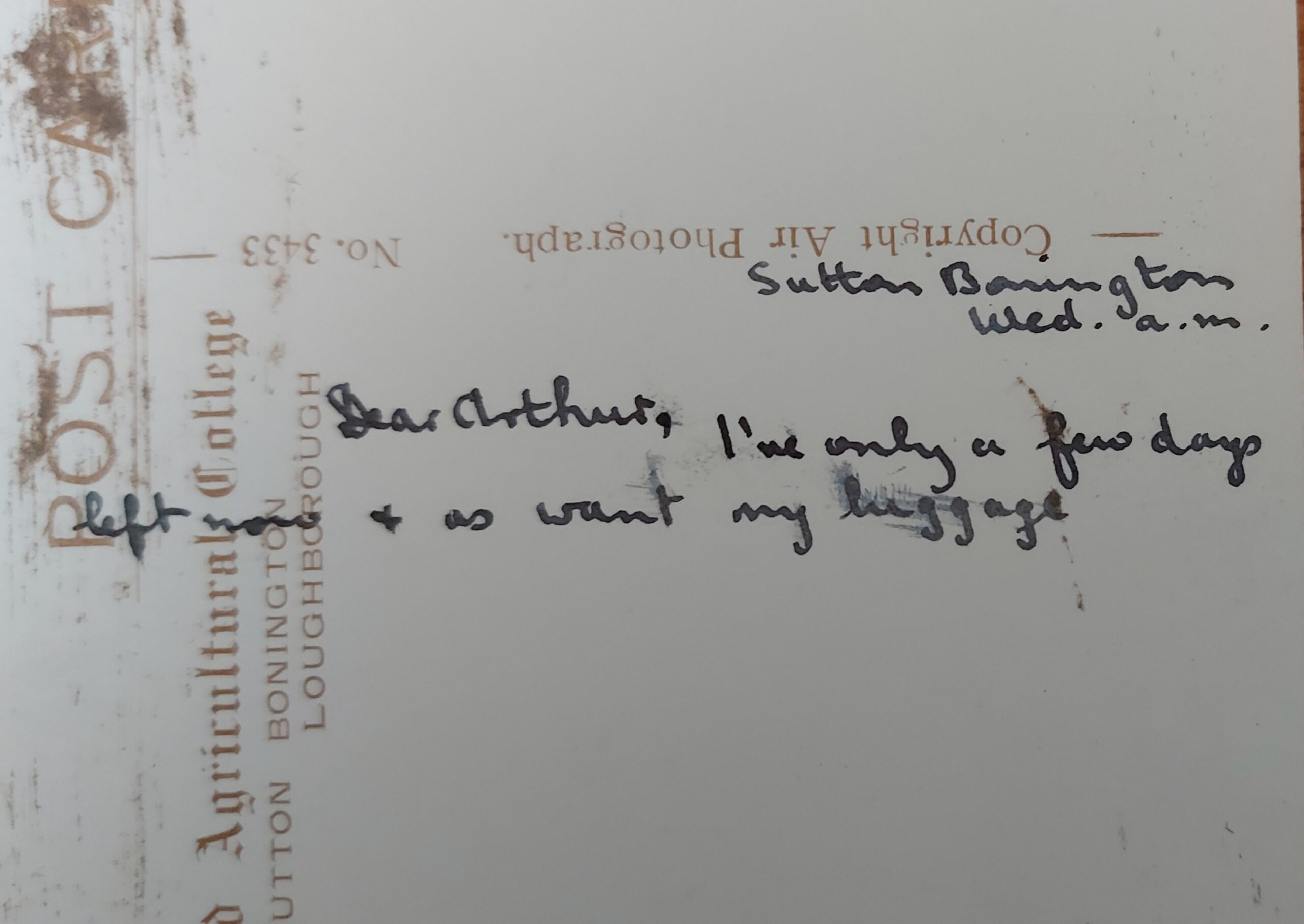 Sutton Bonington, Wed am, Dear Arthur, I’ve only a few days left now and as want my luggage.