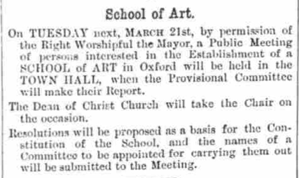As reported in the Oxford Times, on 21 March 1865 – which by my count is very nearly 160 years ago – a meeting was held in Oxford. This led to the establishment of the Oxford School of Art, which opened its doors to students on 22 May that year.