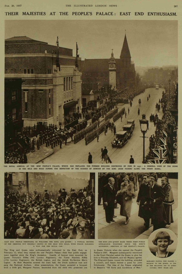 And on 13 February 1937 the rebuilt People’s Palace was opened by the new King George VI and Queen Elizabeth (who most readers will know of better as the late Queen Mother.) The full-page spread from the Illustrated London News below gives some of the flavour. I wonder whether this was part of a post-abdication-crisis public relations push to ensure that the new King was perceived in a positive light? The tale of Margaret Paxton, who gave flowers to the Queen, and was descended from the child who gave flowers to Queen Victoria in 1897, is a publicist’s dream, and will no doubt have taken a bit of work to manage.