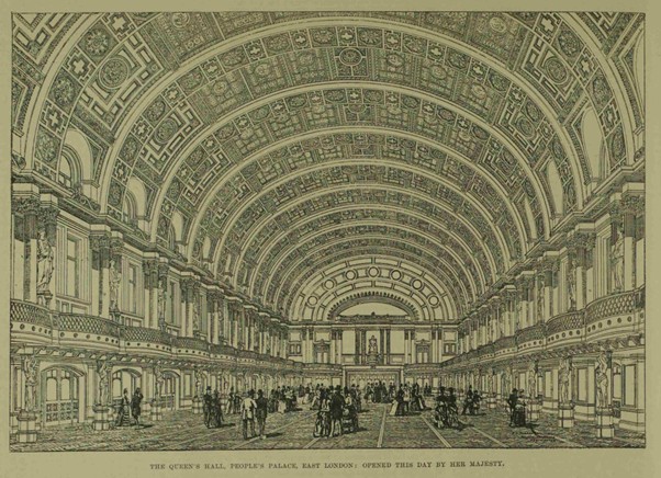 And on 14 May 1887 Queen Victoria formally opened the People’s Palace on the Mile End Road. The picture below, from the Illustrated London News, shows the Great Hall, which was the only element which had been completed at the time. It had a capacity for 2000 people seated, and was most magnificent.