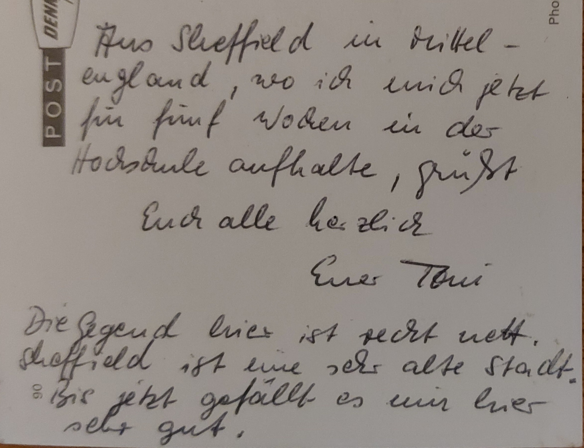 My German isn’t up to a detailed translation, but it seems the sender was spending a few weeks at the polytechnic (Hochschule is the German equivalent), and that despite the image, Sheffield is in fact an old city.