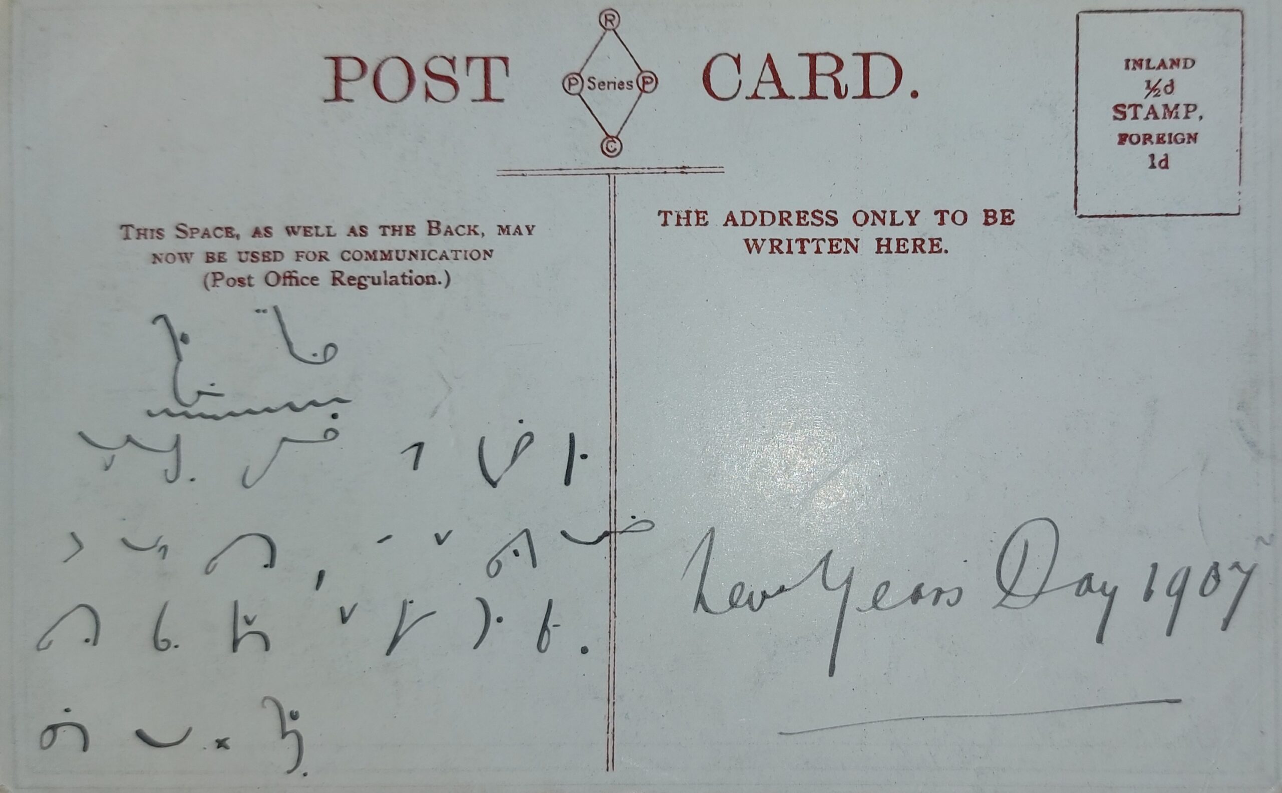 Dated New Year’s Day, 1907, there’s a message in Pitman shorthand. Which I can’t read. But thanks to the power of Twitter, and the kindness of Annie Rosina Compton (and friend) and Kathryn Baird (who has written a book on shorthand postcards!), I can share what the message says: