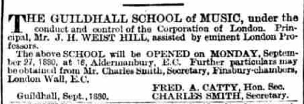 And in September 1880 the City of London corporation did something novel: they established a municipal school of music, the first of its kind in the UK. The Guildhall School of Music was opened initially in a disused warehouse within the city. The first principal was Thomas Henry Weist Hill, a concert violinist, sometime director of ballet at Drury Lane, and conductor of English opera at Her Majesty’s Theatre.