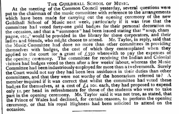Some 121 concerts had been given since the school opened, academic staff numbers had risen from 29 to 90, over £80,000 had been paid in fees, and the City Corporation provided a subsidy of £200 per annum. I personally think more ceremonies should include statistics, as a service to future bloggers.