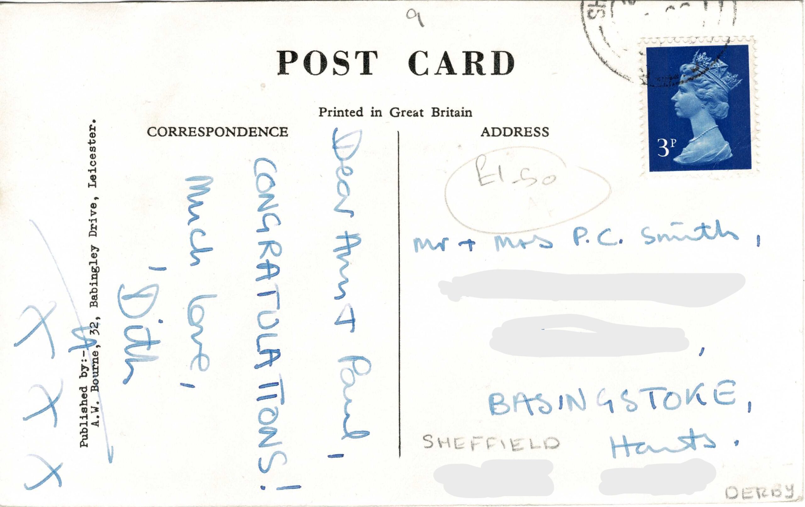 The card was posted, but I can’t read the postmark, so don’t know when. The 3p stamp shows it was after decimalisation. If it was in 1971 or 1972 it was sent first class; if it was 1973 it was sent second class. Those are the only options for that stamp.