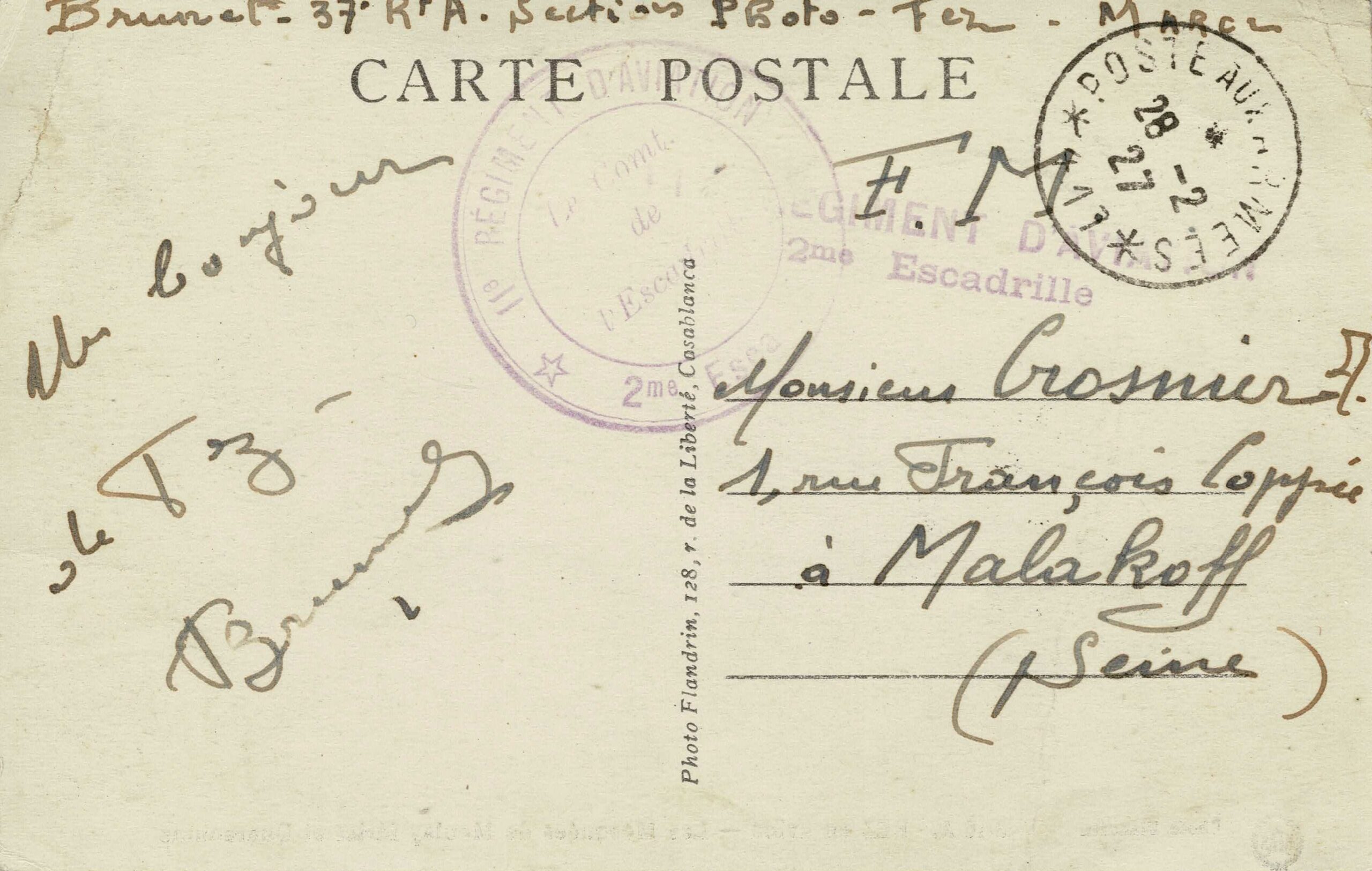 The postcard dates from this time: my French isn’t up to scratch, but I think it is saying that the image was taken by one of the French air force units stationed in Fez in 1927. The picture on the front of the postcard shows two mosques. The Al Quaraouiyine university is the building to the right centre, with the tall stone minaret and the white-walled buildings with steep roofs. The presence of the French military reminds us that the French occupation was by force: it was only in 1926 that the first armed resistance to French rule was ended.