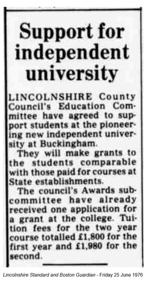 Buckingham continued its journey parallel to the mainstream university sector (albeit still with an element of state support – see the below snippet from the Lincolnshire Standard and Boston Guardian in 1976) until 2001, when it subscribed to the QAA and joined in with the sector’s quality assurance system. From 2004 its students were able to access loan funding via the Student Loans Company, which enabled more students to attend: between 2007 and 2012 the university roughly doubled in size, although it was (and is) still relatively small.