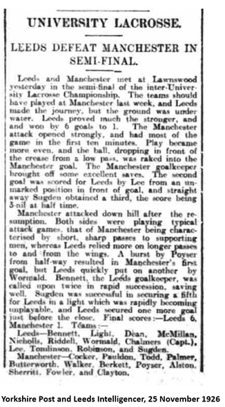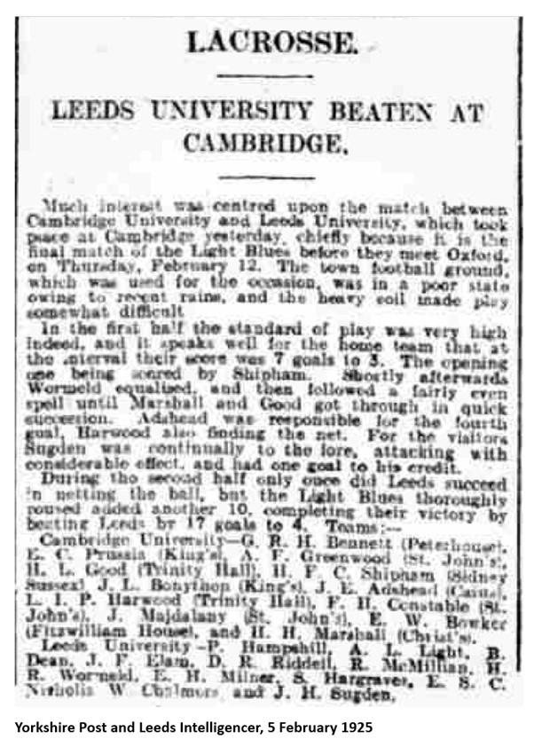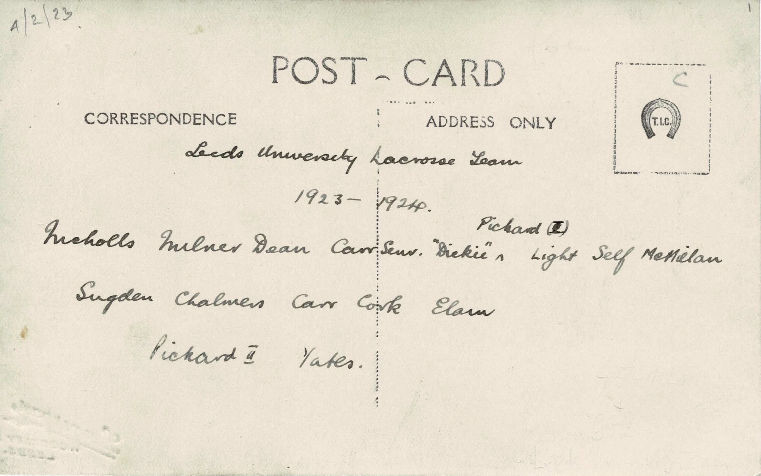 Here’s the Yorkshire Post and Leeds Intelligencer of Thursday 5 February 1925, reporting on the Leeds University lacrosse team’s defeat at Cambridge. This has some overlap with the names on the card, and gives us initials – AL Light, B Dean, JF Elam, R McMillan, EH Milner, ESC Nicholls, W Chalmers and JH Sugden. Useful for approximating the dates of graduation; and clearly these were the more junior students in the photo on the card.