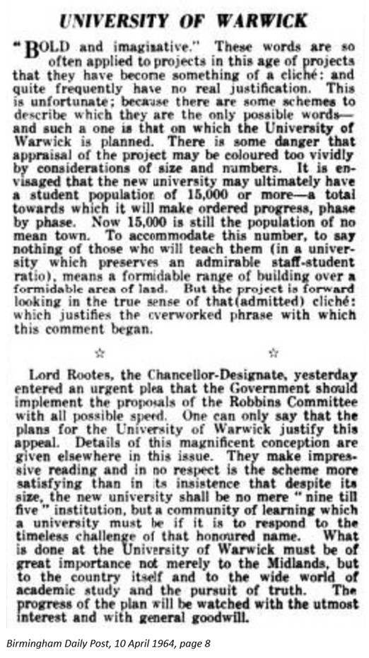 This was to be the University of Warwick, and on 10 April 1964 the Birmingham Daily Post reported on the publication of its development plan and fundraising appeal, which sought to raise £4 million of the estimated £58 million total cost.