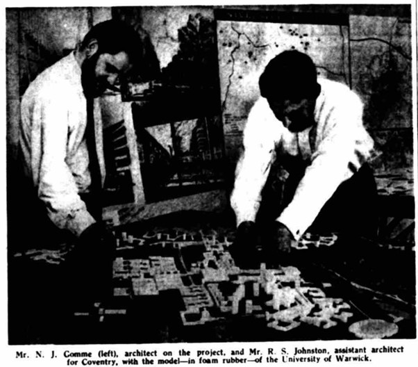Delightfully the same newspaper also prints a grainy photograph of the architects with a model of the university. Those familiar with Warwick might wish to see whether they can make out any of today’s university in the photograph.