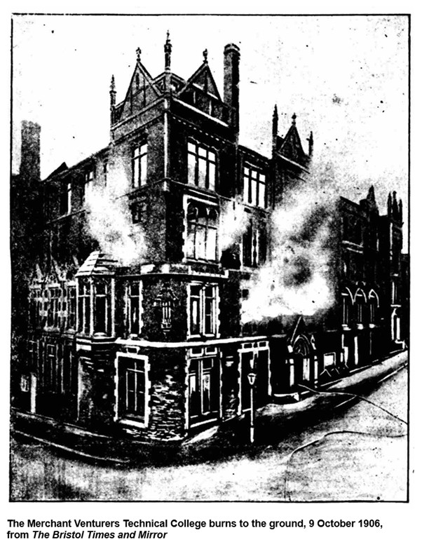 In 1595 the society established a school for mariners’ children. Over the years this would have developed; and in 1894 it was re-founded as the Merchant Venturers’ Technical College, with very fine new buildings, including forced air heating and ventilation systems. The college burned down in October 1906 – “reduced to a mere shell”, in the words of the Western Daily Press.