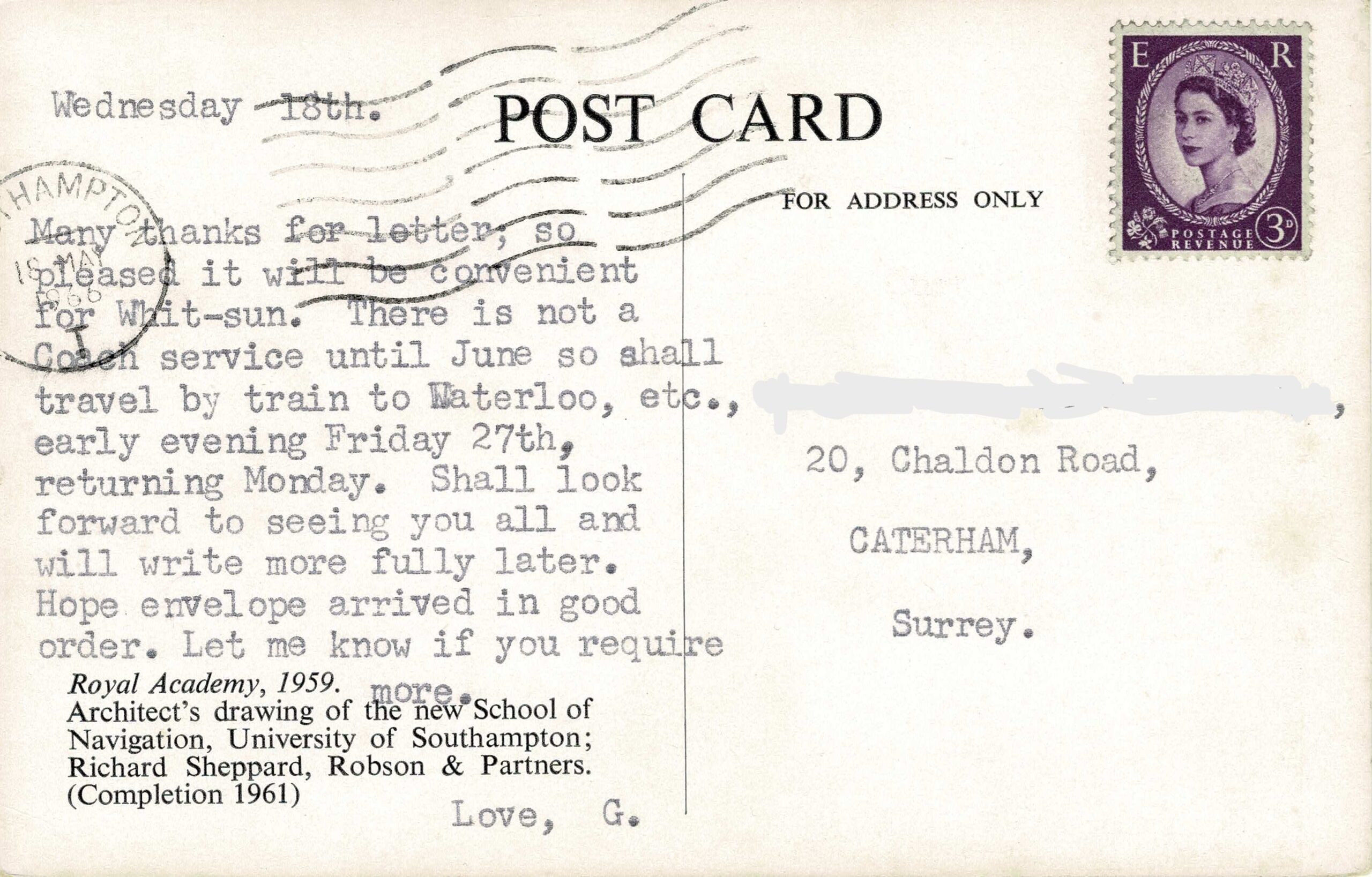 The card was written and posted on Wednesday 18 May 1966. Very unusually, it is a typed message. A busy senior staff member, perhaps, who had access to secretarial support?