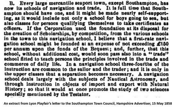 Hartley died in 1850, but his bequest was not finally clear of the courts until 1858, and the town could then think how to create the institution he had suggested. The advice of the government was sought, and in April 1859 Professor Lyon Playfair – secretary to the Department of Science – proposed that the new institution should include a school of trade and navigation. His argument was reported in the Hampshire Advertiser on 15 May 1858: