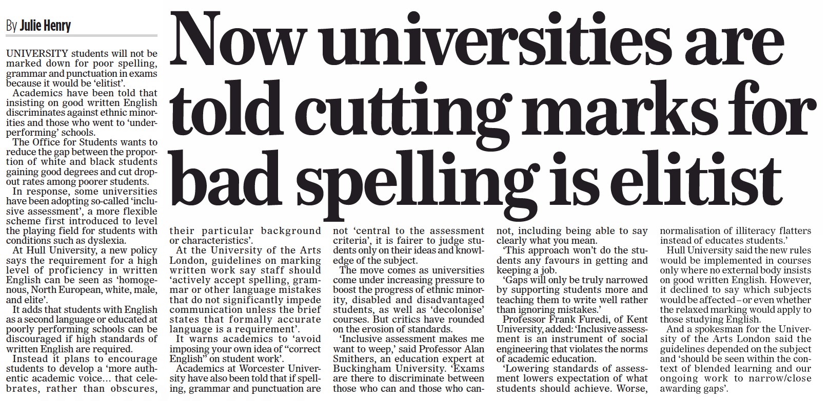 Cast your mind back to April 11th 2021. As its big “bash universities” story of the week, the print version of the Mail on Sunday treated its readers to the news that universities had been told that “cutting marks for bad spelling is elitist”.