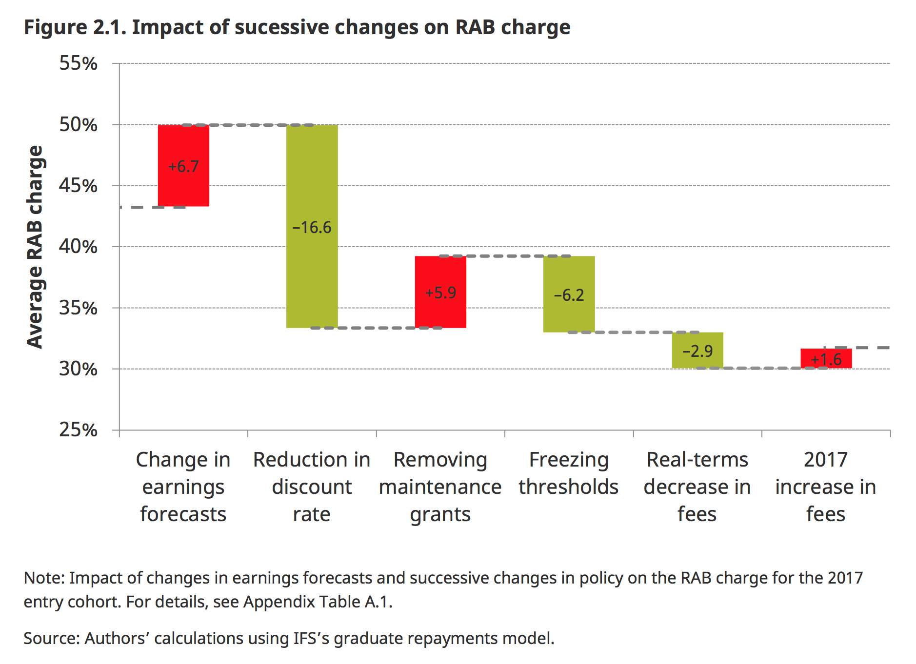 The report is also one of the first to deal with the effects on government finances from the way the RAB charge is calculated. Figure 2.1 offers a useful visualisation of the way RAB has fluctuated with policy and accounting decisions alongside changes in the wider economic environment. The current estimated RAB charge (31.3%) has dropped from the 2012 estimate (43.3%) via a combination of a reduction in the discount rate, a drop in real terms in the value of fees, and the freezing of the repayment threshold. The external pressure on RAB (via changing earnings forecasts) has been upwards – with the replacement of maintenance grants with loans also moving RAB up.