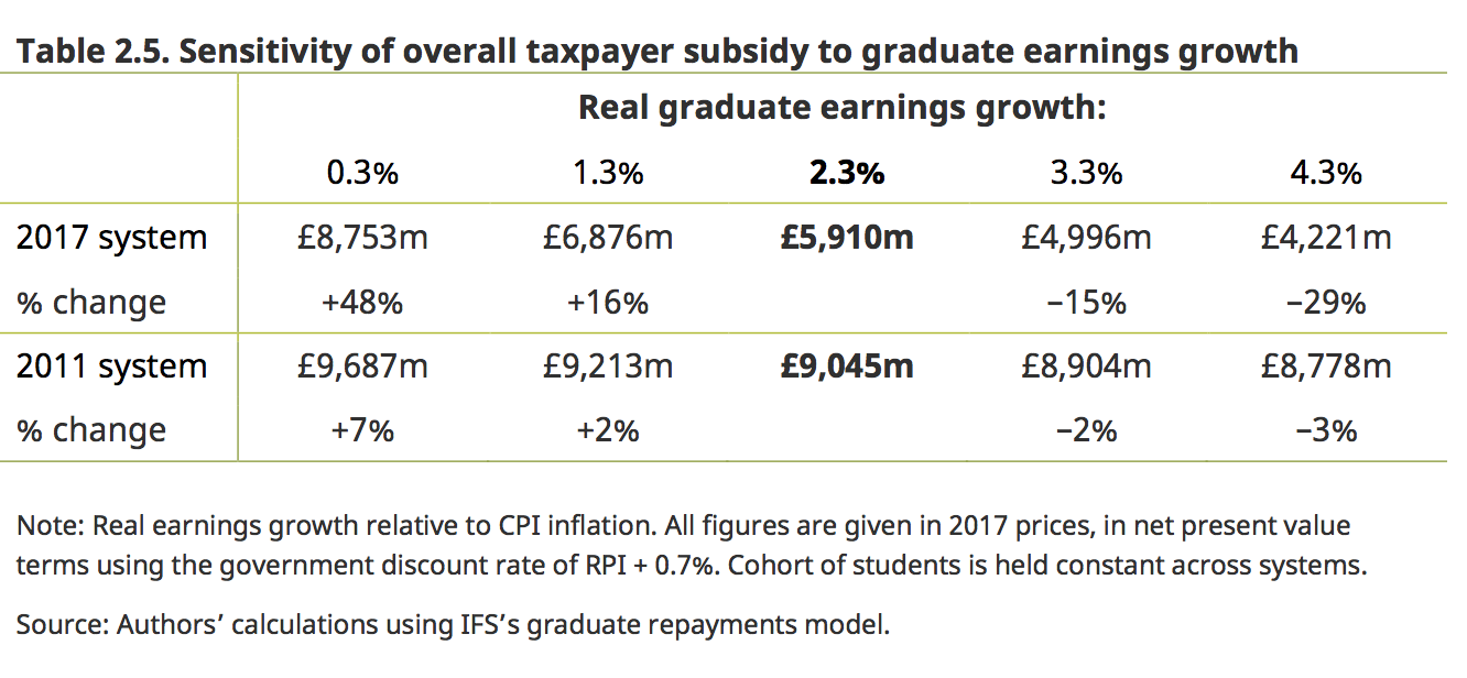 The current system of fee and maintenance loans has decreased both short term and long term direct government funding for higher education while increasing institutional funding, but the long-term benefit is linked to the performance of the graduate job market and the wider economy. A 2% decrease in expected graduate earnings increases the long run government contribution by 50%!