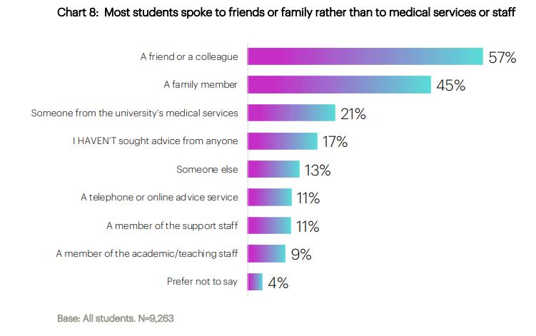 And it’s notable – if not especially surprising – that students turn to each other over their mental health. Even where types of students are more likely to form friendships, the extent to which we support students to support each other – particularly in difficult residential settings – has been the subject of previous research.