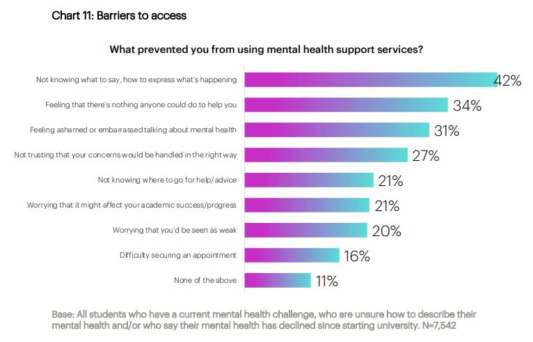 Just under half (with or without a mental health condition) said that their university was doing well when it to comes to supporting students with their mental health in general. But awareness seems to still be an issue – students who knew how to access help were nearly three times less likely to say their mental health had declined since starting there. And those same students were half as likely as others to be experiencing poor mental health at the time. Another chart on barriers also contains at some elements that look fixable: