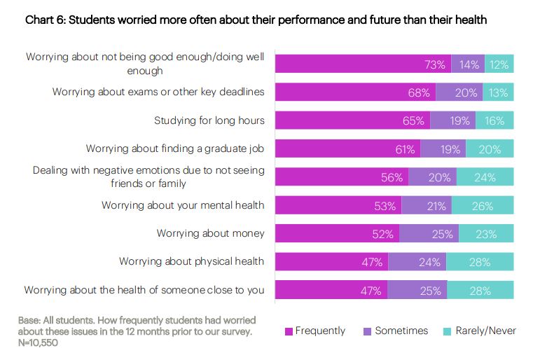 There’s an interesting stat early on in the report that I’ve not seen equivalents on before, that looks at what students were worrying about last winter. A whopping 73 per cent were worried about not doing well enough, 68 per cent were worried about exam and course deadlines, two thirds were worried about workload and studying for long hours, and almost half were worried about theirs or others’ health.