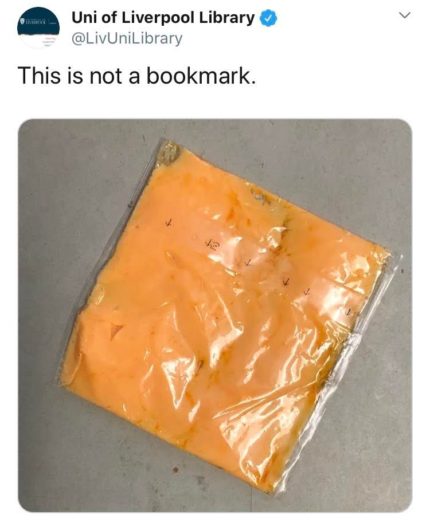 The Tab (which is rapidly becoming the higher education media outlet of record given the regularity with which it is now quoted in mainstream press) reported that the library had broadcast the fact that a student had handed in a book with a rather cheesy bookmark. As The Tab put it: “you cannot brie serious”.