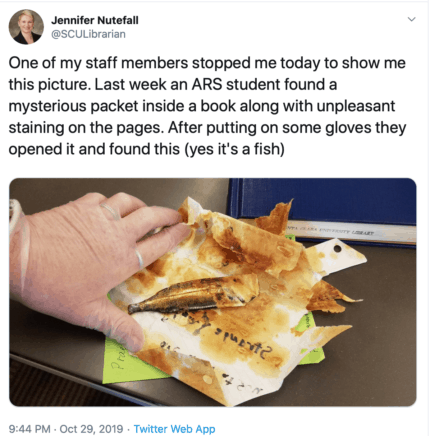 And then, even more fishy, was this tale from Santa Clara University of a rather surprising find in a library book. It seems it dates back to some historical fun and games with a rival institution: