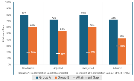 In scenario B, the only difference is that Group B students have a completion rate of 70 per cent, while 90 per cent of Group A complete their course. Out of those students in both groups who do graduate, there is still a 20 per cent attainment gap. The interesting thing is what happens once you adjust the attainment gap by including those who did not complete. As the panel on the right of the chart shows, this adjusted attainment gap jumps from 20 per cent to 30 per cent.