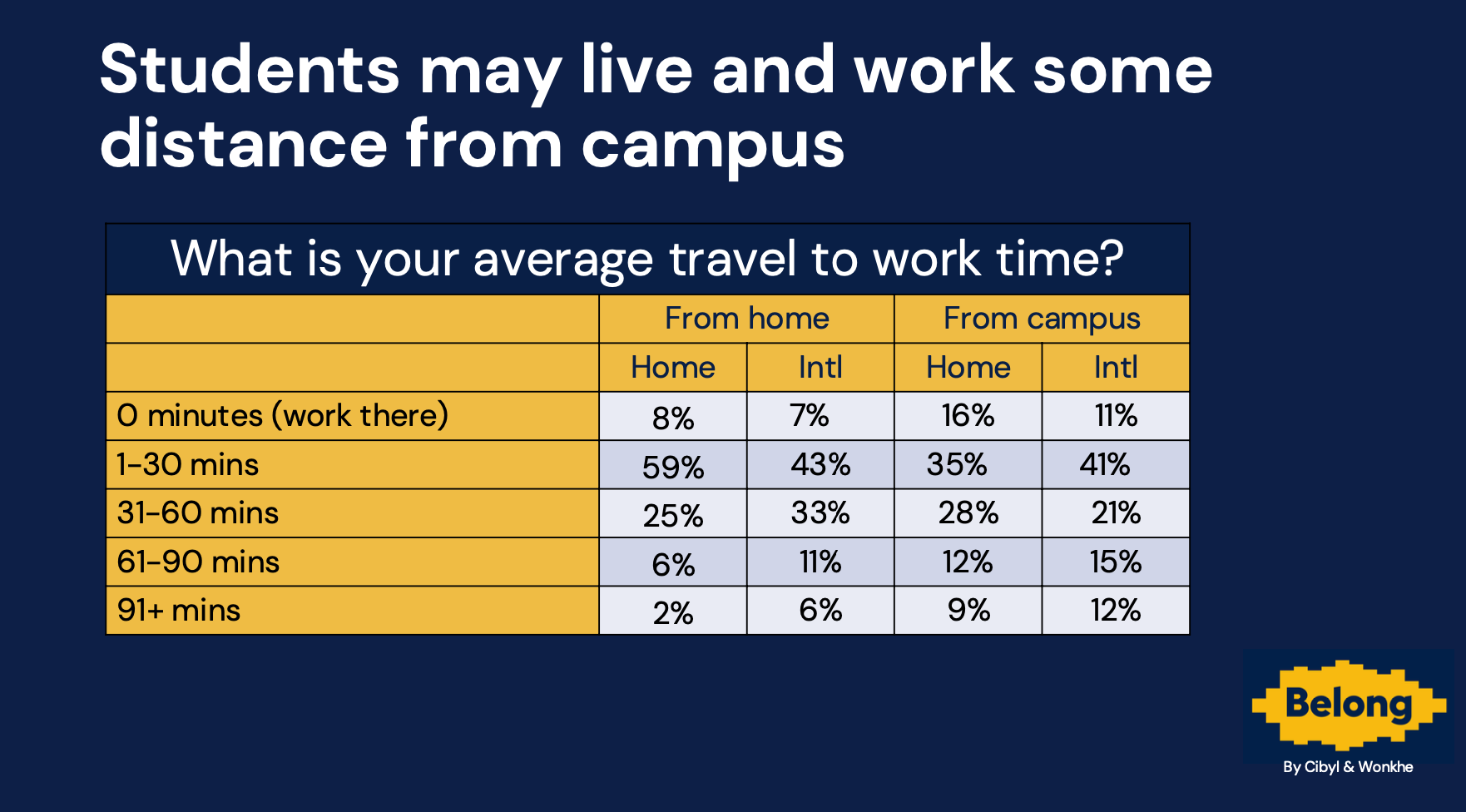 But hours spent at work and on independent study don’t account for the time spent travelling to work. In our sample, almost one in five home students have a 60+ minutes travel to work time from campus, rising to 27 per cent of international students.