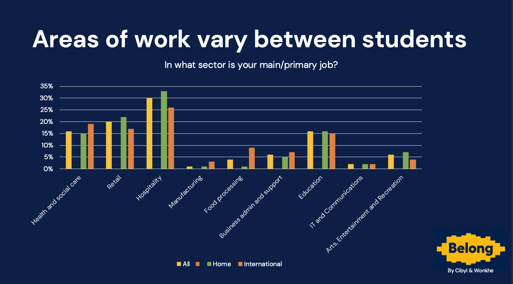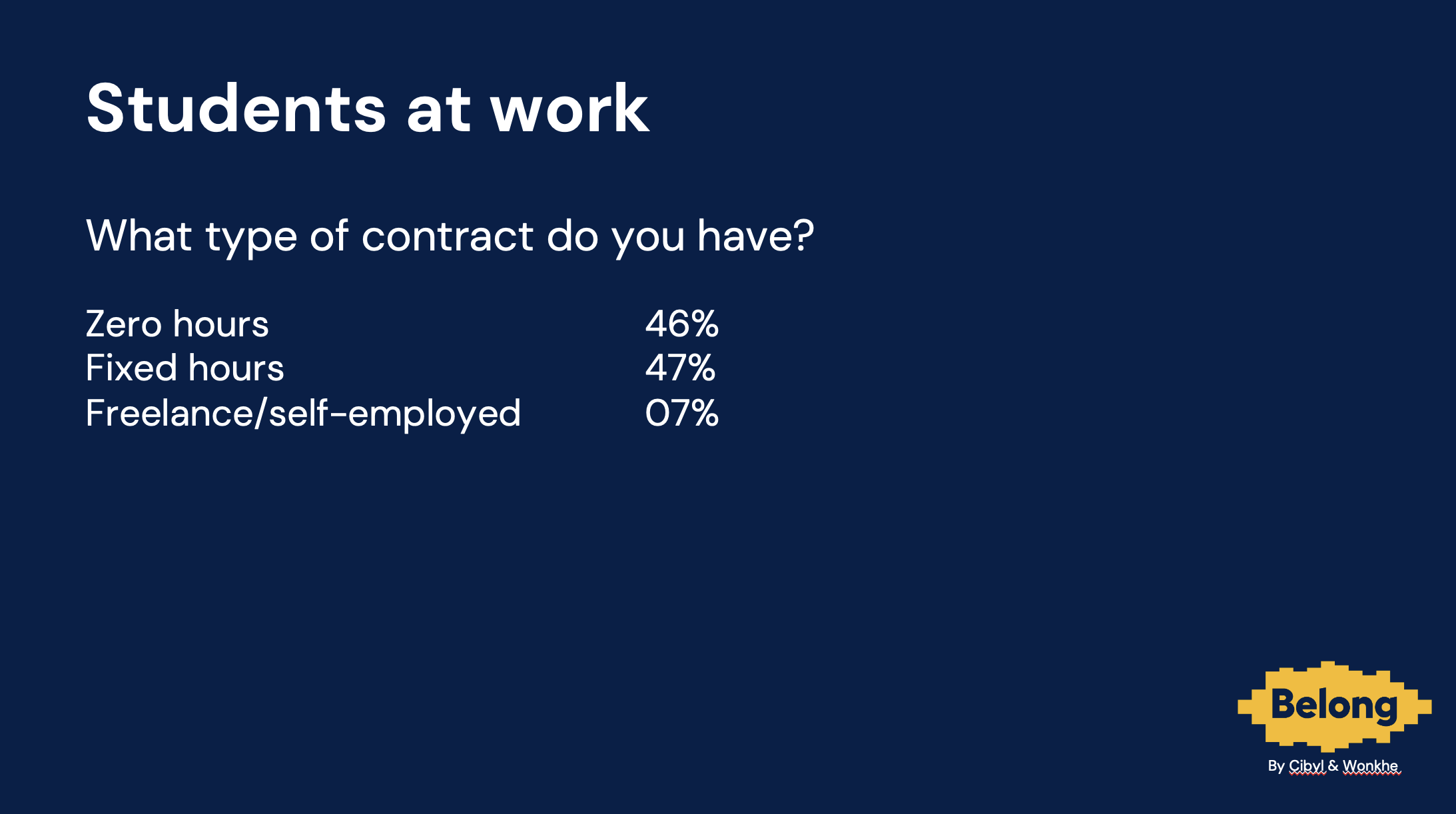 We were also keen to understand the type of contract that students held – not least because there are real risks in the forthcoming Employment Rights Bill, given its reduction of flexibility in “zero hours” contracts could see a significant reduction in the availability of such jobs both on-campus and in the community.