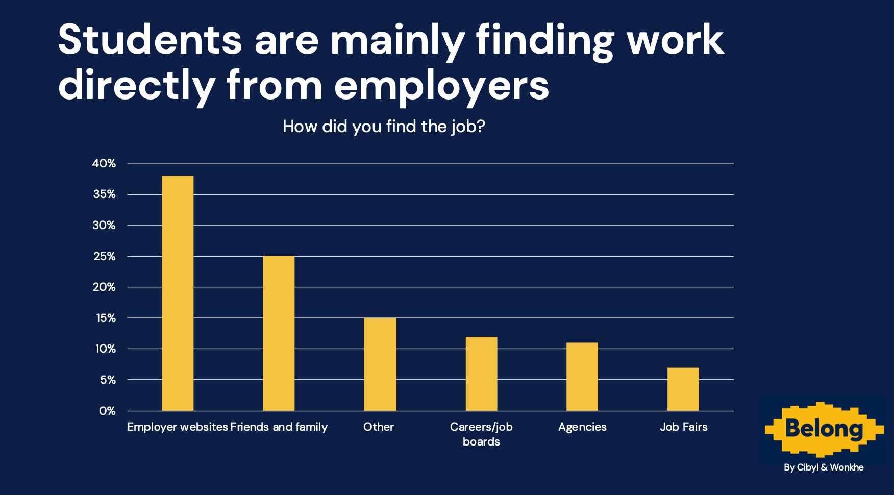We were quite interested to discover how students found work. A minority of students have found the job they are doing via a university or SU service, with the majority relying on web searches or friends and family, a resource which is not evenly distributed between the diversity of students on campus.