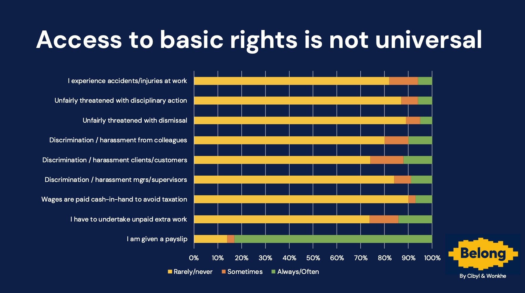 We then asked about basic rights at work. Only 83 per cent of students are “often or always” getting a payslip, one in four are regularly required to work unpaid extra hours, and one in four regularly experience accidents or injuries at work. Discrimination at work – from employers, colleagues and clients/customers is also a significant problem – and a significant minority are threatened with disciplinary action or dismissal.